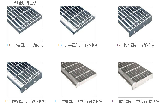 ◆ 我公司生產(chǎn)的踏步板根據(jù)有無(wú)前護(hù)板和與梯梁聯(lián)接方式有四種形式,表示為T(mén)1,T2,T3,T4。